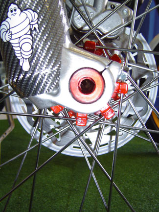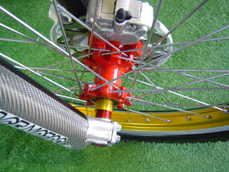 Buje de la rueda delantera pintado en rojo,