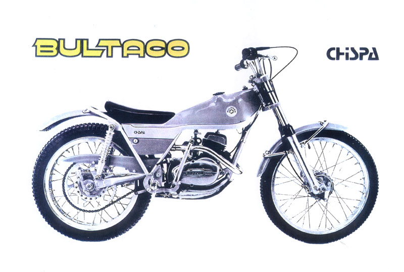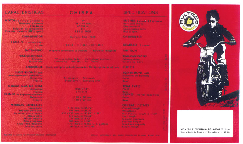 El modelo de Bultaco de trial destinado a los niños era la Tirón, pero se había quedado anticuada, era demasiado pesada para los pequeños y además la Montesa Cota 25 estaba teniendo un gran éxito. Así en 1974 se lanza la Bultaco Chispa, que sustituye a la Tirón, que cesa en su producción. La Chispa era una réplica en miniatura de las Sherpa "Kit" 124 y 125, realmente bonita, ligera y muy válida para hacer trial por niños a partir de los cuatro años. Todo estaba hecho a la medida de los niños, salvo las manetas, igual que en las motos grandes. Equipaba un motor Ducati de 47,6 cc y tres marchas. Se mantuvo en producción desde el año 74 hasta el cierre de la fábrica a principios de los años 80. Este catálogo, es en tamaño DIN A4, y en él se muestra una foto lateral en blanco y negro del modelo, mientras en la parte trasera se muestra la ficha técnica. |