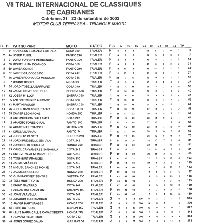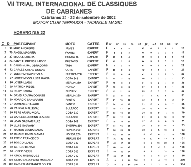El domingo Miquel Cirera y Angel Magriñá afinaron mucho más y llegaron al control horario final con solo cuatro puntos de penalización mientras que Carles Casas también demostraba que con el paso de las zonas iba haciéndose con la Cota y penalizaba un punto más que Cirera. Pasaba el tiempo y Mick Andrews no llegaba, con lo que todos estábamos pendientes de lo que estaba pasando aunque por lo que nos decían algunos pilotos Mick llevaba solo cinco puntos a falta de seis zonas para el final, con lo que tenía margen suficiente. Al rato apareció la James del británico y la cara del piloto denotaba claramente que las cosas habían sido mucho más ajustadas de lo previsto, ya que un conato de gripaje le había cargado con algunos puntos extra en una de las últimas zonas del recorrido. Al final ocho puntos, que le daban la victoria en la general con dos enteros de ventaja sobre Magriñá, siendo tercero Cirera después de remontar dos posiciones.
