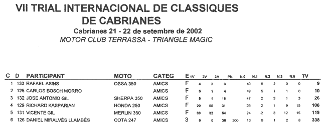 Empezaremos nuevamente por la categoría de las motos más antiguas, en la que un Josep Soldevila absolutamente concentrado y dispuesto a mejorar posiciones a cualquier precio realizó un recorrido absolutamente perfecto sin penalizar un solo punto. Josep pilotó como solo él sabe hacerlo, sin dudas ni fallos, y volvió a ser el Soldevila prácticamente imbatible de la primera mitad de la temporada pasada. La cuarta posición después de la jornada del sábado comprometía, y mucho, sus aspiraciones a llevarse otra vez la victoria en la Copa Catalana, pero tras Cabrianes dejó el campeonato sentenciado.