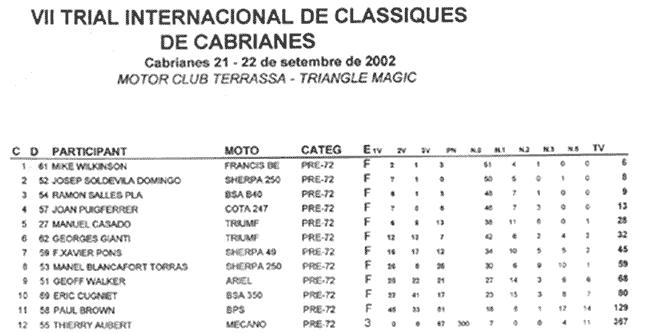 En el cómputo final, de todas formas y a pesar del "forcing" de Soldevila, la ventaja de Mick Wilkinson era más que suficiente para mantenerse en primera posición y llevarse para Yorkshire el bonito trofeo de ganador en Pre-72. Hay que decir que el excelente piloto británico solo compite ocasionalmente sobre su Francis-Barnett de los años cincuenta, y en esta temporada los aficionados a los triales de clásicas solo habrán podido verlo en los Pre-65 de Escocia y en Cabrianes.