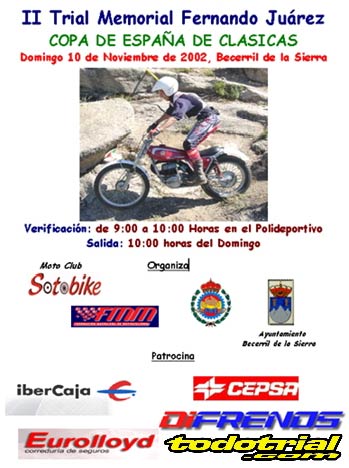 Hay que recordar que el sábado 9 por la tarde se disputa también en Becerril un trial puntuable para el Campeonato de Madrid de clásicas. Los pilotos con licencia nacional que lleguen a Madrid con tiempo pueden tomar parte en este trial, sin duda una buena oportunidad para adaptarse al terreno y empezar a medir sus fuerzas con los pilotos locales.