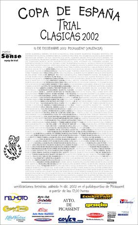 El Motoclub Sense Peus, con el incombustible Javier Gil a la cabeza, está realizando un gran trabajo y con la ilusión que les carazteriza seguro que nos sorprenden con un magnífico trial. Ya hace unos meses anunciamos en Todotrial la bonita idea de realizar el cartel de la prueba formando una figura trialera con los nombres, población y moto de todos los participantes en la Copa de España, y así ha sido, ya sólo el cartel es objeto coleccionable para los participantes, sin duda una magnífica idea.