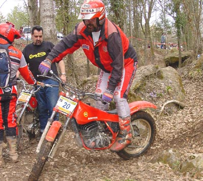 Como ya os hemos explicado en la crónica sobre los Pre-72, el trial se lo jugaban los pilotos en el barro de la zona uno, y los puntos de esa zona hacían que al final del primer giro hubiera un triple empate en cabeza entre José Luis Rodriguez con su super-especial Montesa, Josep Manzano Senior con su habitual Bultaco y Santi Anglada, el piloto de Vic que había tomado contacto con las clásicas en Cabrianes 2003 y que se presentaba en Sant Boi con una bonita y efectiva Honda TLR 250. Por detrás de ellos cinco pilotos empataban a dos puntos y siete a tres, con lo que os podéis imaginar como estaban los ánimos de cara a la segunda vuelta, que se inauguraba nuevamente con la embarrada zona uno que estaba algo más complicada tras el paso de cas cien pilotos.