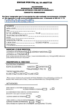El precio de la inscripción se ha fijado en 80 euros hasta el día 15 de Septiembre, y desde ese día hasta las verificaciones previas a la prueba será de 110 Euros. Permitirá tomar parte en los dos días eligiendo en la hoja de inscripción en cual de los Trofeos se desea participar el domingo (Copa de España y/o Madrileño).