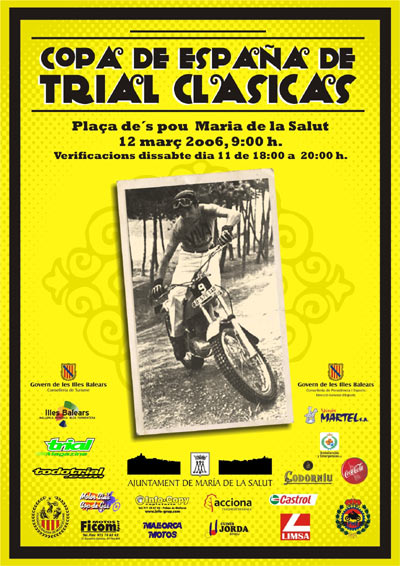 Ya queda menos de una semana para el inicio de la Copa de España de Clásicas en tierras mallorquinas. Las inscripciones serán numerosas y un montón de aficionados de toda España van a estar presentes en María de la Salut. Además el Motor Club Cop de Gas ha notificado que el día 12 de marzo el campeonísimo Mick Andrews con todos nosotros compitiendo en la categoría Pre-72. Es pues una oportunidad de lujo para los trialeros de las islas el poder observar atentamente las evoluciones del mítico piloto de trial.