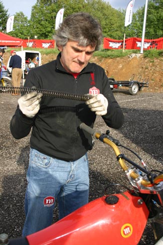 Cirera revisando a punto los muelles de la horquilla