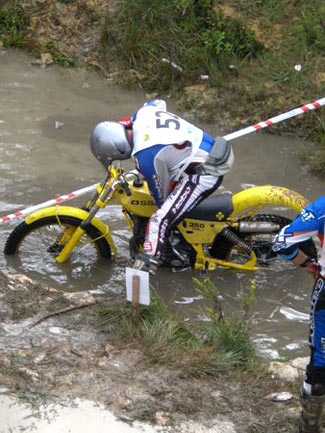 En la interzona, aparte de dos motos en desguaze, un coche patas arriba colchones y todo tipo de porquería, nos íbamos encontrando una serie de pozas, algunas de profundidad hasta media rueda, pero otras hasta el manillar en las que los pilotos tenían que abrir pasos alternativos para no entrar en ellas.
