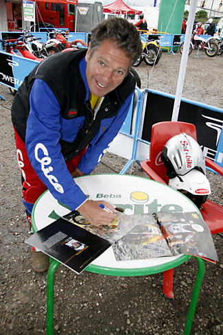 Ver a Bernie bromeando y disfrutando cada momento, cogiendo de nuevo el aire a la Bultaco, realizando ceros magníficos con su gran estilo de siempre, picándose con Manuel Soler en las zonas e incluso parando cada poco durante el recorrido para hacer fotos, es algo que seguro enorgullece a toda la gente del Moto Club Sotobike y también a todos los pilotos y colaboradores que hacen realidad la magia del mejor trial durante los Dos Días de Trial de Clásicas de Robregordo. Los dos, tanto Soler como Schreiber disfrutaron de verdad y sintieron el cariño y admiración del público y los participantes, que no pararon de pedirles autógrafos y fotografiarse con ellos.