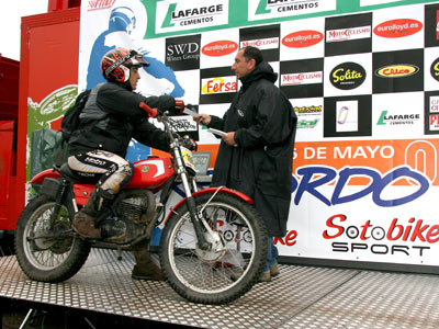 Otra sorpresa más, cuando aparecían dos azafatas empujando una Fantic hasta el centro del salón, y Manolo Torralbo anunciaba por megafonía la cesión de la moto por el patrocinador de la Copa de España, cementos Lafarge, para sortear entre todos los participantes que a final de año hayan participado en el campeonato.