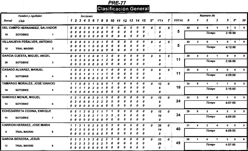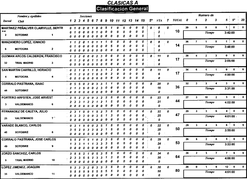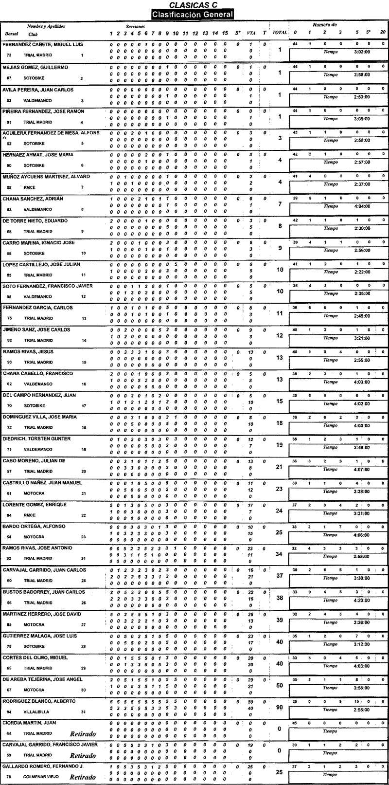 Con las cosas tan apretadas al final el cuádruple empate a un punto se deshizo como antes comentábamos en este orden: primero Miguel Luís Fernández Cañete, segundo Guillermo Mejías, tercero Juan Carlos Ávila y cuarto José Ramón Piñeira. El quinto puesto era para Alfonso Aguilera con 3 puntos, seguido de José María Hernáez y Alvaro Muñoz con 4, Adrián Chana con 7, Eduardo Torre (8), Nacho Carro (9), José Julián López Castillejo y Javier Soto con 10.. y hasta un total de 31 clasificados. Mala suerte para los tres retirados, Juan Ciordia con avería mecánica, Francisco Javier Carvajal y Fernando Gallardo.
