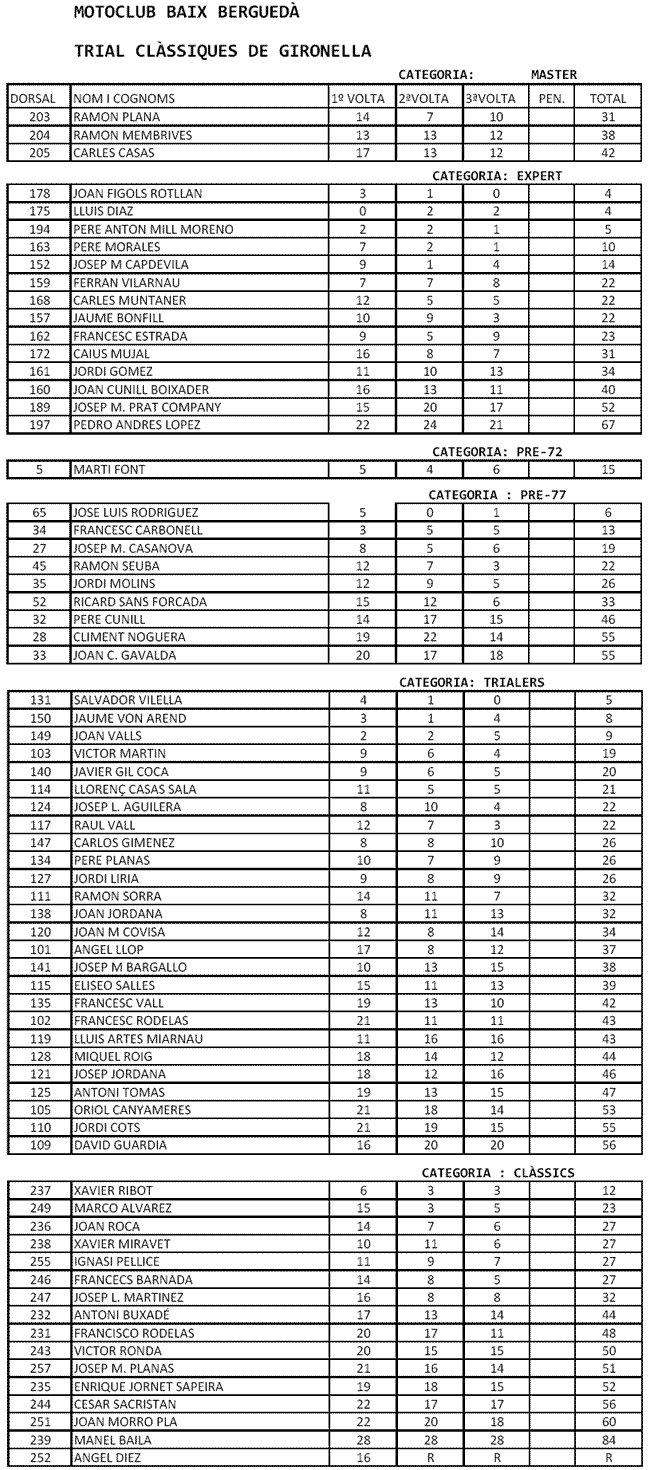 En la categoría Pre '72 sólo se presentaba un participante, Martí Font, que realizaba un magnífico resultado con una penalización de 8 puntos que le hubieran situado segundo en Pre '77. Quizás esta categoría se está quedando demasiado escasa y para rescatarla igual habría que considerar la idea de que se pasase a disputar con el nivel de zonas amarillo, manteniéndose el verde para pre '77, en el que también podrían competir con las monturas Pre '72 aquellos pilotos a los que el nivel amarillo se les queda demasiado fácil.