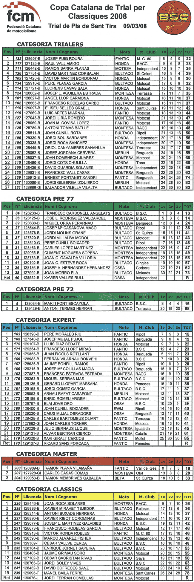 Así en Pla de Sant Tirs solo se presentaban Antoni Termes y Martí Font, que no se pierde una, siendo uno de los merecedores al "premio" a los pilotos que más triales hacen a lo largo del año. Así las cosas Martí no tenía rivales y se llevaba la victoria claramente sobre Termes, con 16 puntos frente a 58.