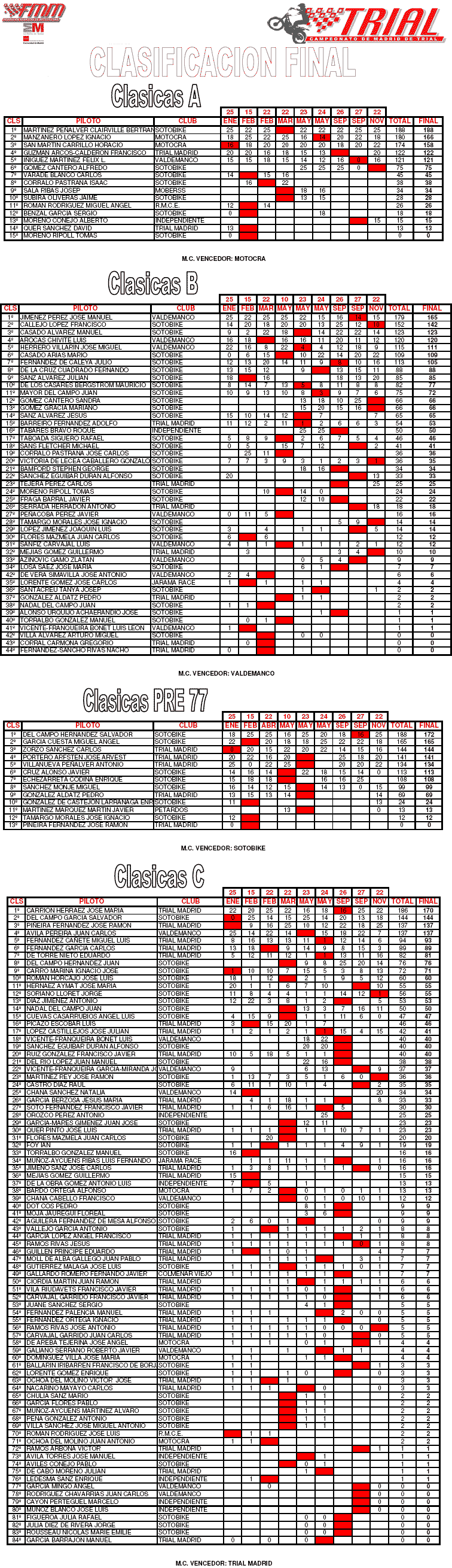 Finaliza así una nueva temporada de trial de clásicas en Madrid, con un balance final realmente positivo en todos los aspectos. Enhorabuena a todos, los organizadores, los controles, los cargos oficiales, los pilotos, los espectadores, los acompañantes, porque entre todos habéis conseguido que el trial de clásicas sea cada vez más bonito e interesante, que reine el buen ambiente y que disfrutemos de verdad. Gracias, el año que viene más y mejor.