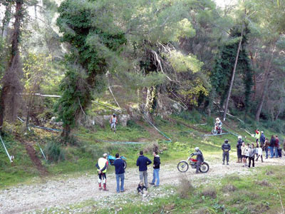 En este lugar situado al borde del Parque Natural del Garraf, donde hay unos terrenos espectaculares para hacer trial, nos tuvimos que limitar a un terreno bastante reducido por culpa de las tan modernas como absurdas modas ecologistas, pero pese a ello resultó un trial más que correcto e interesante, con 10 zonas a dos vueltas en un recorrido de aproximadamente seis kilómetros.