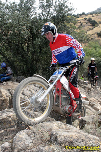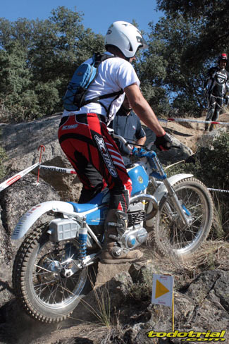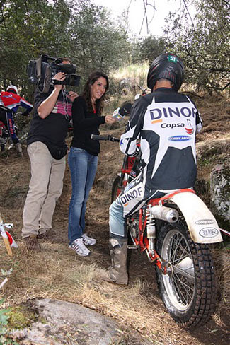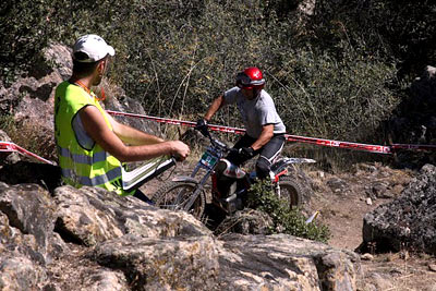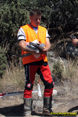 Tambien estuvo un equipo del programa "En Acción" de Telemadrid, que emitirá dos pequeños reportajes el próximo sábado por la tarde, uno sobre el trial y otro de entrevista con Alfredo Gómez. Como no hubo grandes cambios aprovecharemos para comentar algunas cosas no citadas anteriormente sobre las peculiaridades de este trial. Al igual que en Robregordo, en esta ocasión se optó por el sistema de no dar tarjetas a los pilotos, con lo cual no eran necesarios los picas. Esto no gustó demasiado a algunos, porque les impedía llevar la cuenta de sus puntos (lo que se puede solucionar fácil llevando lápiz y papel o una tarjeta propia) pero sobre todo porque no sabían qué les penalizaban los controles, ya que a estos se les había dado instrucciones de no decir las penalizaciones. Este sistema tiene sus ventajas e inconvenientes, pero hay que saberlo adaptar a cada caso. No es lo mismo que se utilice en los Seis Días de Escocia por veteranísimos y probados jueces de zona, que aquí por jueces muy jóvenes que apenas tienen experiencia.
