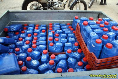 Tras las inscripciones y leer un importante mensaje sobre el comportamiento de los pilotos, relaccionado con una botella, se iban recibiendo los pequeños bidones de gasolina con el dorsal de cada piloto, una genial idea de la que ya os hablamos en el reportaje de Robregordo y que por tanto no vamos a repetir. Al día siguiente a las 10 de la mañana comenzaban a salir los primeros participantes, haciéndolo los últimos cerca de las 12. A tener en cuenta el detalle de la cadencia de salida de los pilotos, además de la espera de varios minutos entre categorías, todo para que no se formen colas en las zonas y los pilotos disfruten de un buen trial, pese a que los controles tengan para ello que pasar muchas más horas al pie del cañón. Ya desde el comienzo era patente el calor, que agotaba más de la cuenta a muchos, influyendo quizás en las penalizaciones. Las zonas eran muy parecidas a las del año pasado, marcadas en terreno de tierra y piedra granítica, con buena adherencia por lo general excepto en los lugares en los que el polvo formaba una fina capa sobre las rocas al paso de las motos.