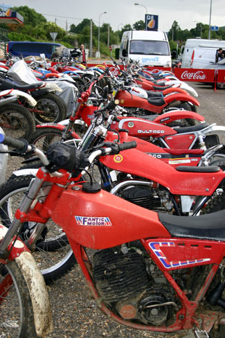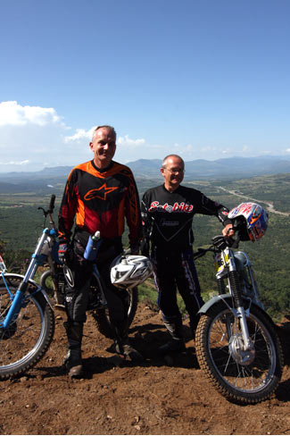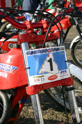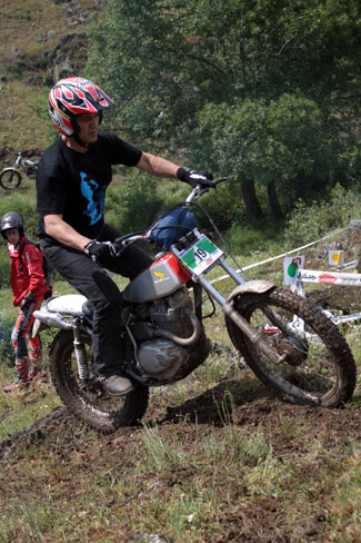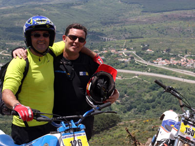 El viernes empezaban a llegar pilotos de todas partes, entre ellos la cada vez más numerosa colonia británica, y este año no sólo de pilotos sino incluso algún ilustre espectador, como Dick, el artesano que fabrica los escapes Wes, que además tuvo el mérito de llegar a Madrid desde inglaterra utilizando únicamente el tren como vehículo. O Jim y John, una pareja muy peculiar que repetía por segunda vez en Robregordo. Uno de ellos tiene una minusvalía al faltarle una pierna y utilizar una prótesis, el otro tiene una visión de sólo un 20% y ambos se ayudan a realizar el recorrido, su objetivo es terminar, pero no lo pudieron conseguir, aunque sí realizar parte del recorrido, con la ayuda de Manolo Torralbo el domingo, el alma máter de este trial y que está a todo, organizar, ayudar, hacer fotos, pero sobretodo gestionar y encargarse de que todo salga perfecto, uno como tantos del MC Sotobike que hacen de todo, ¡gracias!