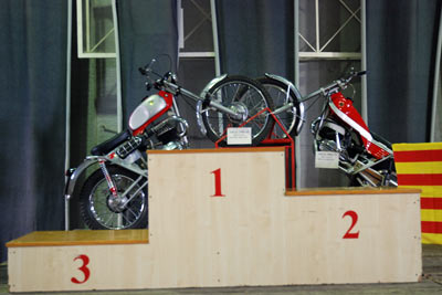De hecho, algunos pilotos (el trial se hacía en modalidad de grupos) llegaron al parque cerrado al anochecer, aunque el reloj se retrasaba -para acortar las tardes- la madrugada siguiente. Pasar la última tarde larga de otoño haciendo zonas es un plan fantástico si te gusta este deporte; comentarlo a posteriori con los colegas en la mesa con un delicioso plato de macarrones, es aún mejor. En Cabrianes los pilotos comen todos juntos una vez terminada la jornada. ¡Brutal! A nivel deportivo y en cuanto a la Challenge Pre '65, la primera jornada se concretó con una victoria de Joan Figols y su Bultaco 200 con 8 pies seguido por Pepe Buixó (BSA) con 12 y Joan Rovira (BSA) con 15. En cuanto a amarillos, destacar la contundente victoria de Xavier Miravet y su James que marcaban sólo cinco pies en las treinta zonas del sábado, seguido por Ramón Palau y Soler (BSA) con 16 y Hug Alemany (Bultaco) con 26.
