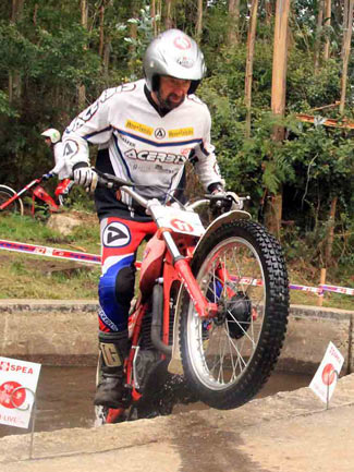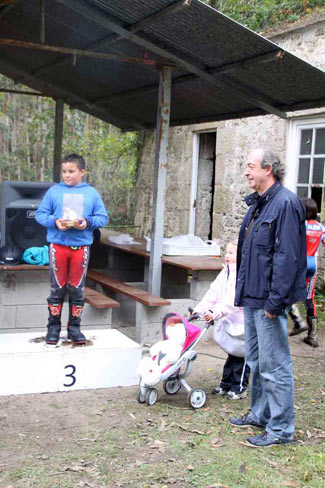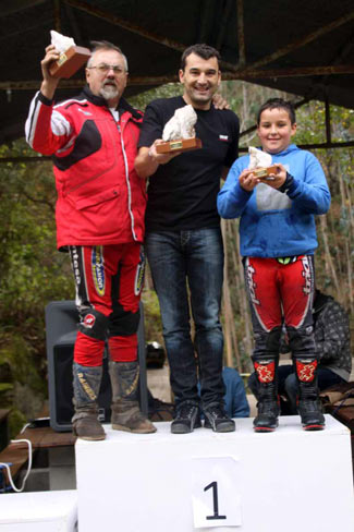 Alberto se queja amargamente del resultado, pero sigue líder destacado de la categoría a pesar de este segundo puesto. Para el podium Martín va como un tiro dispuesto a hacerse con esta posición con una fuerte caída incluida, en realidad la consigue inicialmente tras los primeros escrutinios, incluso, como veréis en las imágenes, subió al podium para recoger su premio por la tercera posición del trial, siendo cuarto Gerardo Solla. Pero una vez llegada toda la documentación a los despachos de la FGM sus técnicos revisan las tarjetas y las hojas de los jueces observando que alguna anotación de Martín no era correcta, cambiando así el resultado otorgando la tercera posición a Gerardo y el cuarto puesto a Martín. Con este resultado Gerardo afianza la segunda posición de la general, y más considerando que el duelo que Casimiro mantiene en esta carrera con Arsenio se resolverá a favor del de Fantic, que logra así el quinto puesto por delante del de Bultaco.