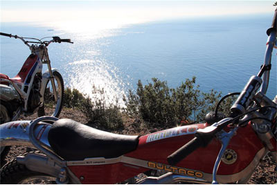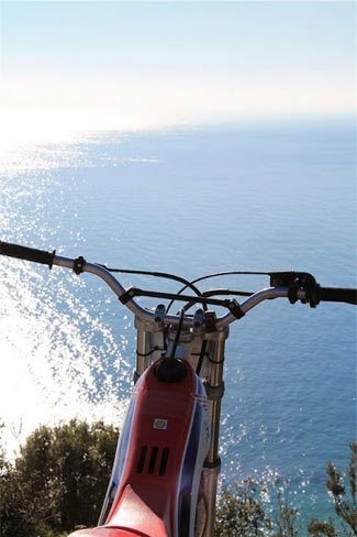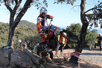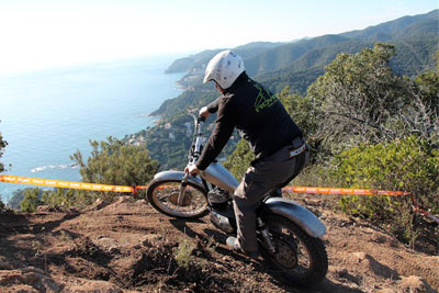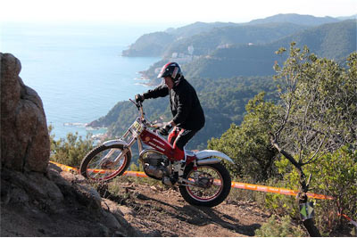 Todos sabemos que en el trial, con el paso de las motos de los participantes, hay zonas que se suavizan pero hay otras que incrementan su dificultad, y esta fue una de ellas para todas las categorías. Era una zona nada peligrosa pero bastante difícil. Después venía la zona 13 consistente en giros cerrados, y subía posiblemente a la que era la parte más bonita del recorrido, una bajada por un sendero muy trialero, con grandes vistas al mar que nos llevaba ya muy cerca de Sant Feliu, donde estaban marcadas las zonas 14 a 18, todas ellas bastante similares pero que ofrecían diferentes dificultades para los pilotos.
