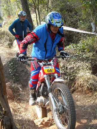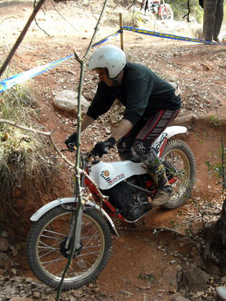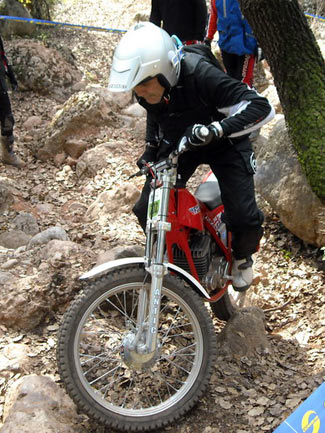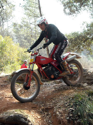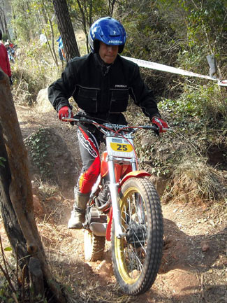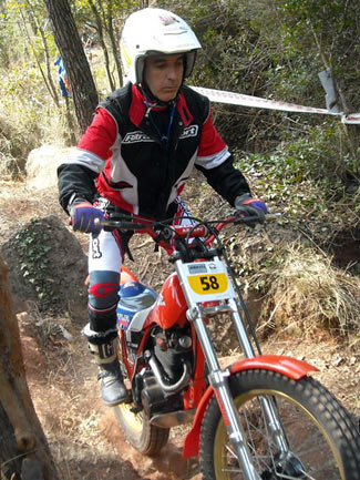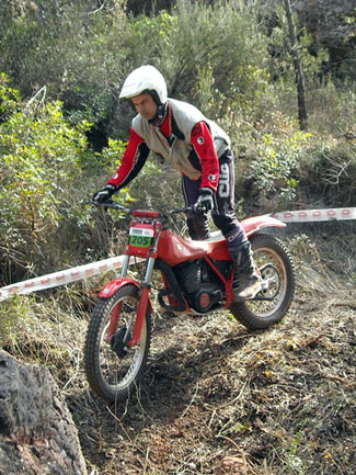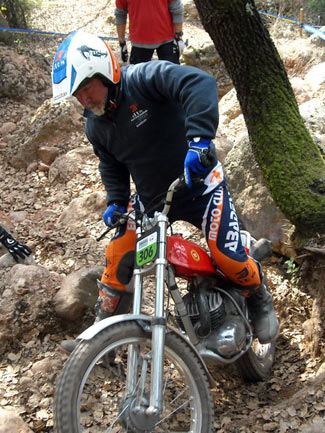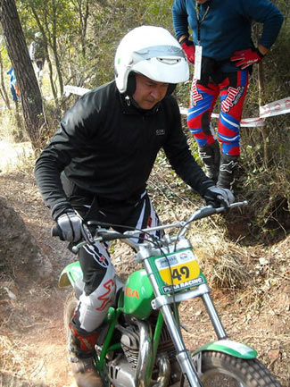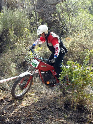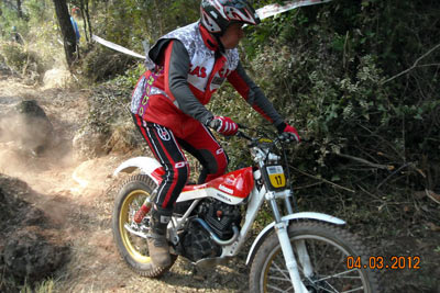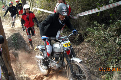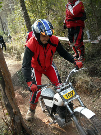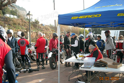 Así, en el apartado técnico, por parte del delegado de la FCM, se empezó a avisar de los elementos no clásicos que tienen algunas de las motos, como suspensiones de Gas Gas motores que no corresponden a la moto (por ejemplo motores de Fantic monoamortiguador y por tanto no clásicas como las 305 o 307, o de Aprilia en algunas SWM), carburadores de compuerta plana, llantas tubeless sin freno de cubierta, manillares y tijas flat bar, etc. Afortunadamente todos los pilotos a los que se avisó de que su moto no cumplía con el reglamento en algunos elementos, entendieron el problema y el sentido que se busca con ello, comprometiéndose a solucionarlo dentro de un tiempo razonable. En ningún momento hubo grandes quejas ni malos modos, lo que significa que se está comprendiendo unánimemente cómo tiene que mantenerse el trial de clásicas para no desvirtuarse. El trial empezaba puntualmente a la hora prevista las 9,30, habiendo acordado la FCM y el Moto Club organizador dar media hora más a la prueba, por la distancia del recorrido y los 110 pilotos presentes. Al final la decisión se mostró correcta ya que nadie penalizo por tiempo.