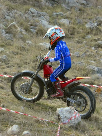 El tercer puesto del podio fue para el madrileño Pablo García Flores que con su Fantic se dejó 4 pies (2-1-1). No me atrevo a decir que zona fue la más complicada porque en cualquiera te podías dejar los pies pero yo apostaría por la 5. Niños con automáticas (KCa) Ningún niño acudió con su moto de cambio por lo que solamente hubo la categoría de motos automáticas. Tres zonas se habían marcado para los pequeños lebreles que debían de pasar dos veces en un sentido y dos en el contrario. César Blázquez García y Marina Rodríguez Gordillo se acercaron desde Candeleda para pasar una mañana rodeados de admiradores y es que niños como ellos son el futuro del trial y además los niños nunca pasan desapercibidos. Podríamos decir que esta fue la categoría más difícil del trial ya que César terminó primero con 18 puntos y Marina, segunda, con 30. Otro invitado más se acercó a Cogeces, el vástago de la saga Garrido que quiso sacar la licencia y poder correr pero la burocracia administrativa prohíbe las licencias a menores de seis años y Hugo Barrera Garrido tiene cinco añitos con lo que este año no ha podido sacarla. El año que viene será, querido Hugo, hasta entonces a estudiar y a aprender lo mucho que tu abuelo, tu tío y tu padre tienen que enseñarte.