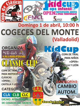 Agradecer a todos los que hicieron que este trial se llevase a cabo, a los miembros del Moto Club Vallisoletano, a los jueces y picas, miembros de la Federación y a los que de alguna manera contribuyeron en la organización de este trial. Agradecer a los vecinos de Cogeces del Monte por la amabilidad y paciencia que demuestran año tras año y carrera tras carrera, ya que sabemos que no a todo el mundo le gustan las motos pero que, poniendo un poco de voluntad por parte de todos, todo es compatible. Agradecer a los pilotos que nos acompañaron viniendo desde lugares tan distantes como Valencia, Navarra o Madrid y a todos los pilotos de nuestra comunidad que se acercaron a Cogeces. Mención especial para el Concejal de Deportes de Cogeces del Monte, el Sr. Fernándo y para su Alcalde, ya que sin su apoyo institucional no se hubiera podido organizar este trial. Al finalizar la entrega de trofeos el M.C. Vallisoletano y el Ayuntamiento nos obsequiaron con unos bocadillos variados y unas bebidas, para reponer fuerzas y comentar la carrera. ¡Que sea por muchos años!. La próxima carrera de este campeonato de clásicas y niños será la del 30 de Septiembre en Pobladura de las Regueras (León) y será coincidente con la Copa de España de Clásicas. En la página www.yotrial.com tenéis otro punto de vista de esta carrea con la crónica que Juan Luis Pérez Salgado, el crono de la carrera, tiene de la misma y con más fotos.
