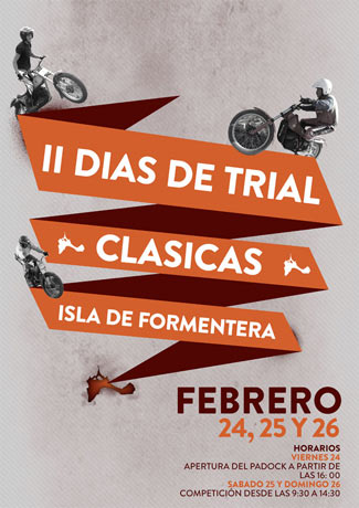 La prueba será puntuable el sábado 25 para el campeonato de Baleares de trial Clásicas y el domingo 26 para la Copa de España de Trial Clásicas, dando comienzo a ambos campeonatos. La puntuación de ambos días se sumará para la clasificación final de los “II Días de Trial Clásicas Isla de Formentera”. En la prueba pueden participar todas las motos de trial clásicas que cumplan las normas exigidas por la FBM y por la RFME en esta disciplina. Ubicación El paddock y dirección de carrera se ubicará en San Francisco. La prueba discurrirá por San Francisco (de donde se dará la salida y llegada de los pilotos) y la zona de Cala Saona, con un recorrido de unos 24 km en el que se ubicarán 12 zonas a las que los pilotos tendrán que dar dos vueltas. Los dos días de competición se realizará el mismo recorrido y las mismas zonas. Niveles Habrá