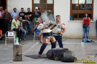 El espectáculo fue muy vistoso y divertido, amenizado por la simpatía y los comentarios de los levantadores. Muchos fueron los trialeros que no quisieron perderse el espectáculo, y algunos fueron elegidos para salir al "escenario" y competir contra los levantadores. Armando Ugarte, Carlos Alzola, Pedro Andrés y nuestra fotógrafa Todotrialera Vanessa Valverde, no se libraron de salir a medirse con ellos, aunque en este caso les tocaría el levantamiento de vaso de vino... Fueron momentos muy divertidos, un gran acierto más para el Moto Club + Gas. Y tras el espectáculo nos ofrecieron una magnífica merendola, en la que compartir charla con amigos trialeros. Como siempre en Maeztu se respira un ambiente muy agradable y distendido, y la terraza del Izki se convierte en una fiesta donde cae la bebida y comida rodeados de trialeros, con un tema de conversación que suele ser el que os imagináis, el trial. En el transcurso del anochecer algunos optaban por retirarse y otros por ir a dar una vuelta por la noche de Vitoria.