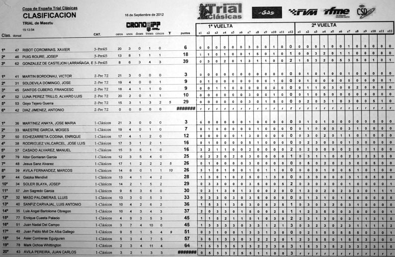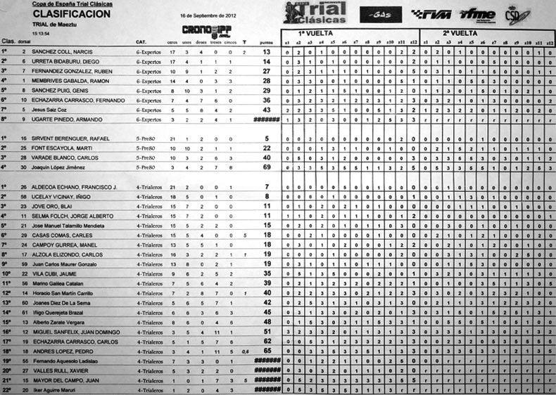Así discurrió un bonito día de deporte en la naturaleza, en el que pilotos y público disfrutaron pese al calor. Al finalizar el trial se procedió a la entrega de premios y a una comida "pica pica" para reponer fuerzas, un detalle más para con los participantes y acompañanates por parte de los organizadores. Como anéctota lamentable queda el incomprensible e inveraz titular publicado en el periódico local El Correo unos días después "Polémica por el uso de la vía verde para una prueba de motos en Maeztu" que podéis ver aquí. Y es que aún hay gente que se cree que sólo ellos tienen derecho a disfrutar del campo, y que no se han enterado de que el trial es un deporte totalmente compatible con la naturaleza, y con ello muestran una absoluta ignorancia además de falta de educación e intolerancia. Más lamentable es como a un único personaje de estos se les da crédito en un periódico como este, aún a costa de perjudicar su propia credibilidad. Veamos ahora brevemente lo que sucedió en lo deportivo en cada una de las categorías. En las clasificaciones figuran en mayúsculas los pilotos que puntúan para la Copa de España.
