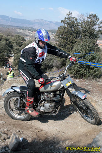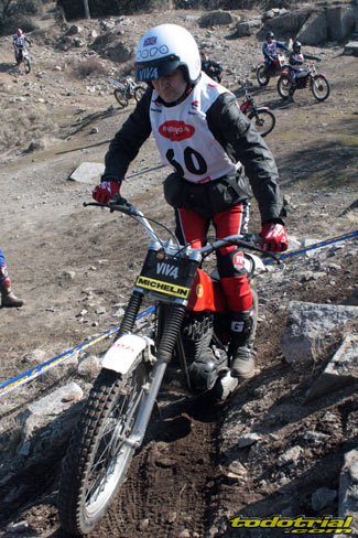 En Trialeros, también nivel verde pero sobre motos de 1980 y posteriores hubo 14 participantes, resultando muy emocionante la lucha por la victoria, a la que aspiraban al menos 5 pilotos, aunque uno de ellos quedaba fuera de juego tras alguna caída en la segunda vuelta, este era el actual campeón de la categoría Manolo Jiménez. Con un rival menos, José Miguel Herrero se hizo finalmente con la victoria al sumar 11 puntos sobre su Honda TLR 200, tres menos que Julio Fernández de Caleya, que para este año cambia su Bultaco por una Fantic 240. Completaba el podio con 15 puntos, uno más que Julio, Paco Callejo sobre su sempiterna Merlin DG3, lo que significa que se ha recuperado perfectamente de la rotura de pierna que sufrió el año pasado al ser embestido por un coche mientras circulaba por Madrid con su scooter. También con 15 puntos pero con un cero menos, Luis Arocas era cuarto, demostrndo un año más que las Ossa TR80 son muy competitivas, a pesar de no muy vistas en los triales. A continuación se situaban Manuel Casado y su Fantic 300, David Quer con Honda TLR y Michael Sans, también con Honda, completando los 7 primeros puestos. En la categoría Pre 72, ya en el nivel amarillo y más accesible, se mantiene con una inscripción que no está mal, 6 inscritos, aunque se echa de menos más motos de este tipo. Quizás con la nueva reglamentación de la que se habla está a punto de aparecer, se favorezca la presencia de motos más originales y no preparadas excesivamente y puedan animarse más participantes, ya que estas categorías son las que más pueden atraer a los no tan puramente trialeros pero sí más amantes de las motos clásicas. También aquí la lucha por la victoria fue apretada, y finalmente se la llevó Antonio Díaz sobre su Ossa MAR, con un total de 6 puntos, lo que indica lo accesibles que fueron las zonas. Con 2 puntos más finalizaba Salvador del Campo a los mandos de su Triumph Pre '65, y con 12 completaba el podio Enrique Echezarreta, que volvió a causar la admiración del público con su espectacular Triumph bicilíndrica y el rugido de su motor.
