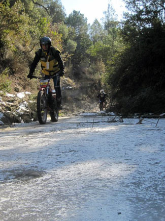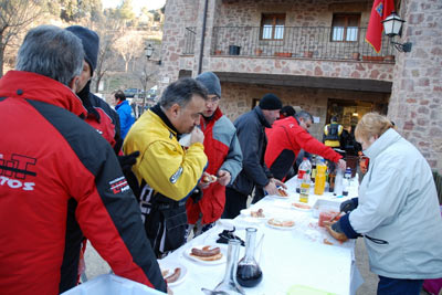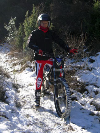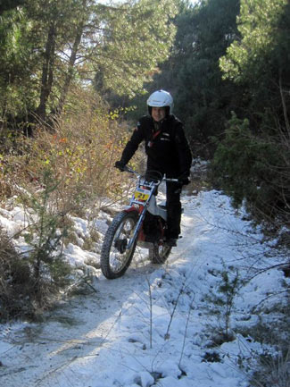 En cuanto a la competición en sí, se retrasó media hora el inicio de la misma pues a la llegada a Mura a las 8:30 de la mañana la temperatura era de 10 grados bajo cero!!! De hecho, durante la semana anterior, se generaron dudas sobre su celebración, especialmente debido a la nieve caída diez días antes, que todavía se mantenía por los caminos. Antes del inicio de la prueba los miembros de Motocat escenificaron un mensaje de ánimo en forma de pancarta para su socio Josep Lluis Aguilar, "Piru4rt", que ha pasado unos cuantos días en el hospital como consecuencia de una mala caída trialera y a quien desde estas líneas deseamos una rápida recuperación. En las fotos, las caras reflejan la bajísima temperatura ambiente del momento. La interzona, larga y ya bastante dura de por sí tratándose de un trial de clásicas, vio incrementada su dificultad por la nieve y el hielo con bajadas en las que el control de la moto generaba dificultades a más de uno. Eso sí, impagable la parte del recorrido que seguía el curso de una riera totalmente helada con grandes placas de hielo imposibles de esquivar y que exigían un control total de la tracción.