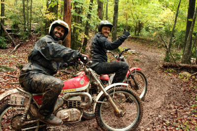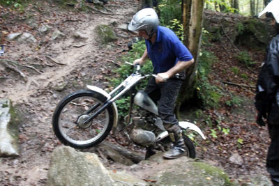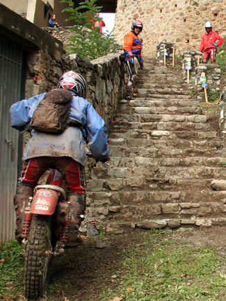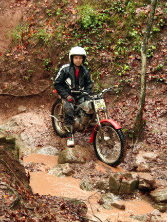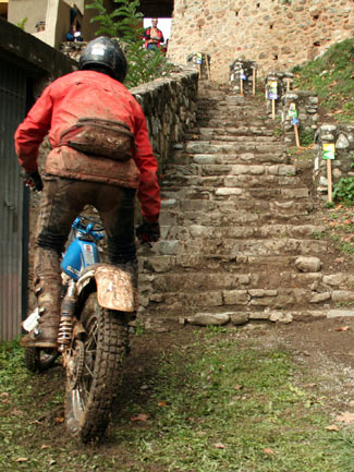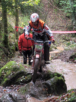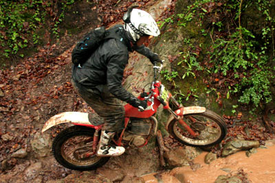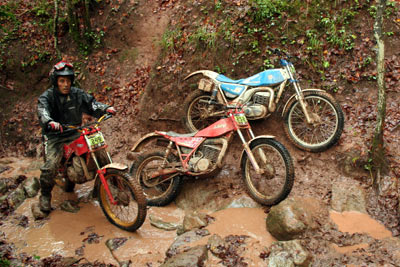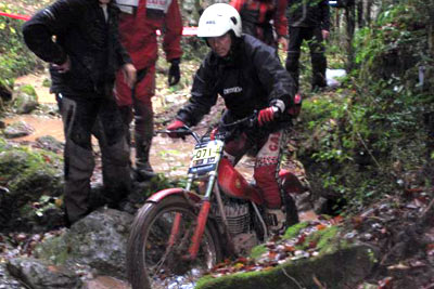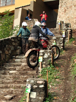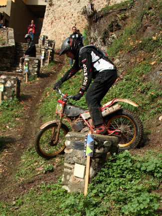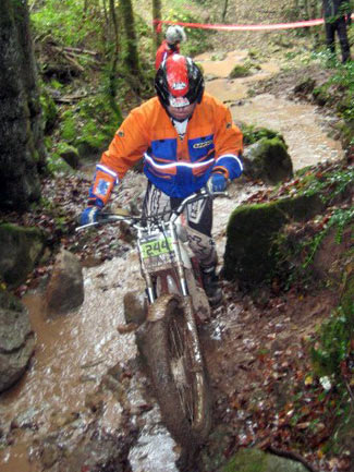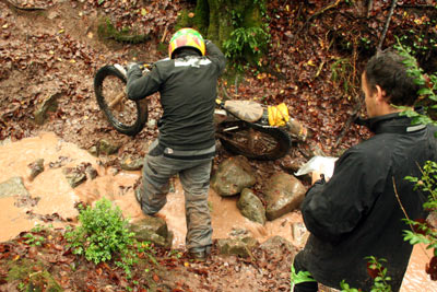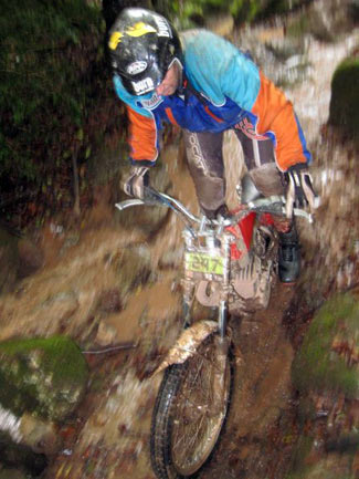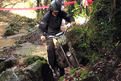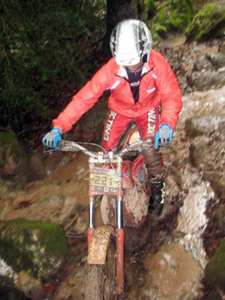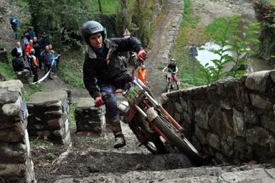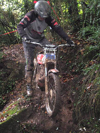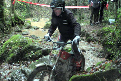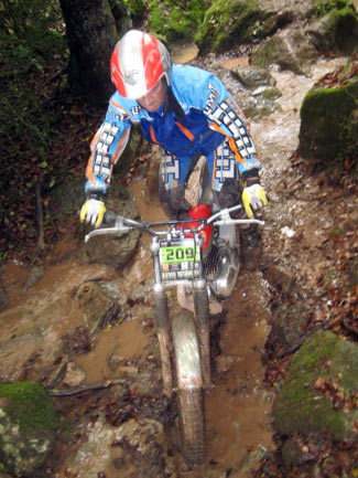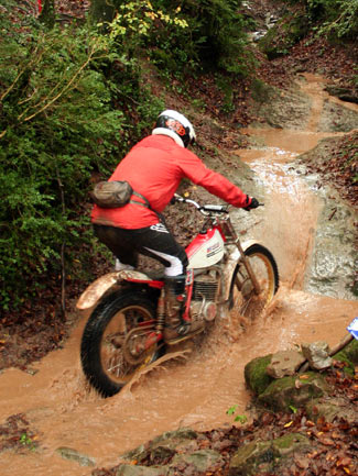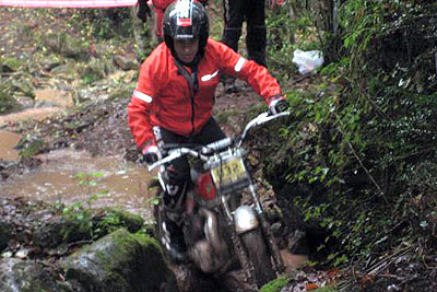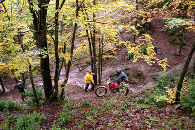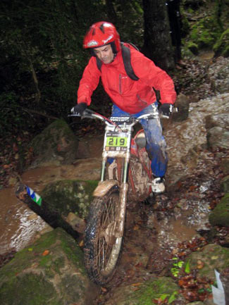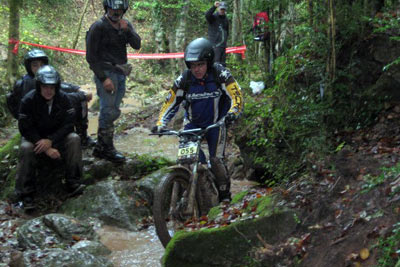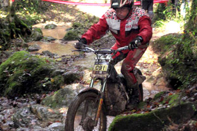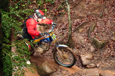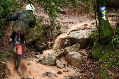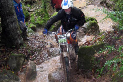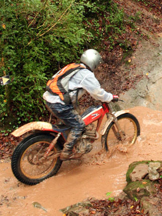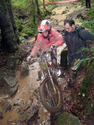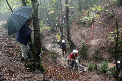 Y es que Santigosa tiene a fama de ser el trial más técnico y duro del año, pero no por peligrosidad de sus zonas sino por el entorno en que se desarrollan, sobre preciosas torrenteras que han hecho famosos los triales de Santigosa en sus más de 40 años de historia, pues en ningún otro sitio se pueden encontrar zonas así. Lo positivo de Santigosa y la lluvia son las zonas de torrentes por los que baja el agua, que limpia todo rastro de barro y al ser piedra caliza el agarre es perfecto, permitiendo espectaculares subidas y rampas sobre roca muy técnicas en las que lo difícil no es tener tracción, ya que hay de sobra, sino ir por la trazada perfecta, pues desviarse lo más minimo obliga a poner el pie o a protagonizar aguantadas increíbles y aplaudidas por otros pilotos. Estas fueron las zonas predominantes, sobre todo el segundo día, por lo que todos los participantes disfrutaron enormemente. Los mayores problemas de adherencia llegaban en el recorrido, no tan largo comoen otros triales, pues no hacía falta repostar, pero sí lo suficientemente complicado como para poner a prueba la resistencia física.