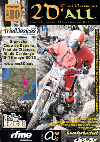 Seguidores y mochileros Muy importante, sólo se puede seguir el trial en moto de trial y esta deberá de estar matriculada y asegurada. La organización proporcionará un distintivo de seguidor a un precio de 15 Euros por día, que incluye el desayuno. Sólo podrán circular por el recorrido las motocicletas identificadas como piloto, organización o seguidor. Los Mossos de Esquadra o los agentes forestales pueden sancionar a los seguidores no autorizados y también pueden sancionar a los seguidores autorizados que no sigan el recorrido marcado. Nota importante del MC 80 sobre la participación en All con licencia FCM (15-5-2013) El MC 80, con todos requisitos en regla y presentados en plazo, pidió en su día la aprobación para que el trial de All 2013 fuese, aparte de puntuable para la Copa de España de trial de clásicas, un trial social donde todos los poseedores de licencia federativa catalana no homologada pudieran participar. Históricamente todos los triales de la Copa de España dentro y fuera de Cataluña han sido compartidos junto con triales sociales o campeonatos locales. La FCM la semana pasada, denegó este permiso alegando que no lo consideraba conveniente. El M80 ha estado trabajando toda la semana a todos los niveles a fin de que la FCM finalmente deje correr a pilotos con licencia catalana no homologada. Se está haciendo todo lo posible, tanto por parte del Motor Club 80, como de mucha gente que nos esta brindando su apoyo y está poniendo sus propios medios para intentar desbloquear esta situación. Gente a la que desde aquí queremos agradecerles sinceramente su apoyo. No entendemos la posición de ciertos miembros de la FCM que pretenden boicotear el trial de All y la Copa de España por motivos que desconocemos y que creemos que poco tienen que ver con el ámbito deportivo de la prueba. Poniendo estos motivos por encima del interés de la afición y de los propios pilotos a los que dicha federación representa. A tres días del trial la FCM no se ha pronunciado acerca de las alegaciones y peticiones que se han hecho para desbloquear el tema. Nos han llegado muchos mensajes de malestar de pilotos que quieren correr en All, con la licencia catalana y su federación no les deja. A nosotros nos parece muy grave que un piloto catalán no pueda correr un trial en su propia comunidad. El MC 80 no es responsable de esta situación ya que como he comentado tiene todos los permisos y solicitudes en regla y entregados en plazo. Si algún piloto se encuentra en esta situación creemos que debería reclamar a la FCM directamente. Tenemos confirmada la asistencia de 6 pilotos ex mundialistas, que hace que venga a cubrir esta prueba un periodista del mundo del trial que cubre las noticias en medios del sector tanto Francia como en Inglaterra. Este conflicto si no se arregla será noticia y traspasará seguro las fronteras de nuestro país dando una imagen que nuestro deporte no se merece. Sentimos la desesperación que está causando este tema en muchos pilotos. Por parte del MC 80 seguimos con todos los medios posibles poner remedio a esta situación. En cuanto tengamos noticias os la haremos saber por este medio. Reportaje