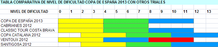Con esta medida se espera que los pilotos que habitualmente corren en amarillos en las 10-15 primeras posiciones, encuentren en el nuevo nivel verde un trial muy a su nivel, dejando este color para que los que habitualmente están por el medio-final de la tabla disfruten del trial. Los pilotos que habitualmente corren en verde y están en las primeras posiciones, encontrarán en el nivel azul un trial apto para ellos, sin peligro y sin grandes escalones. Recordar que con la nueva clasificación por coeficientes, no hay obligación alguna de que el año de la moto designe el color en el que hay que correr. Este nuevo criterio de niveles será similar al de Cabrianes, trial que siempre se ha caracterizado por una dificultad suave y que se adapta perfectamente a esta filosofía. En el siguiente gráfico comparativo se puede observar esquemáticamente como será el nivel de la Copa de España de Trial de Clásicas 2013 en cada color, en comparación con otras competiciones ya conocidas.