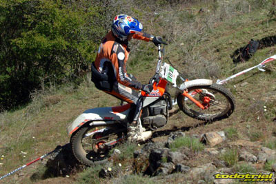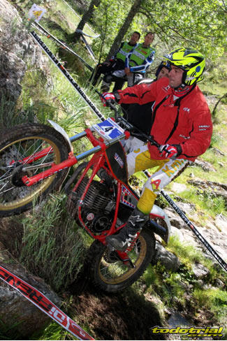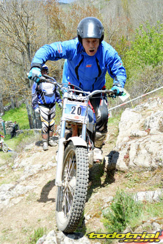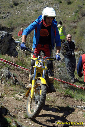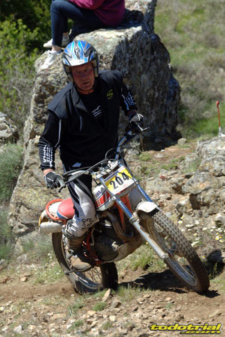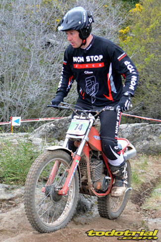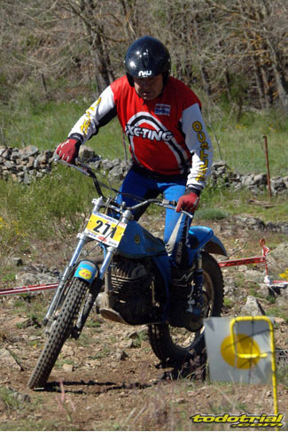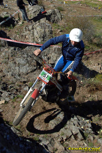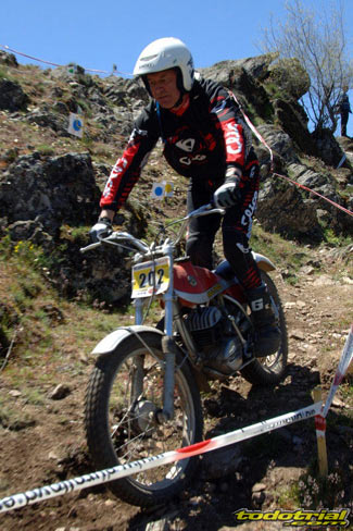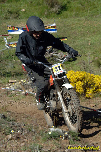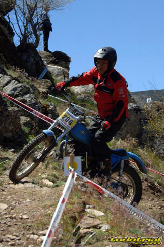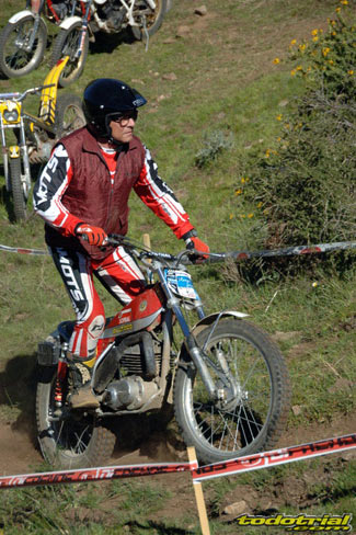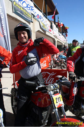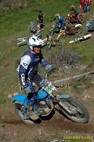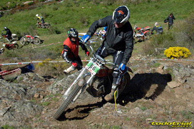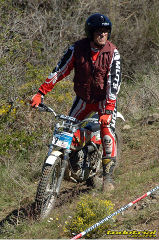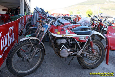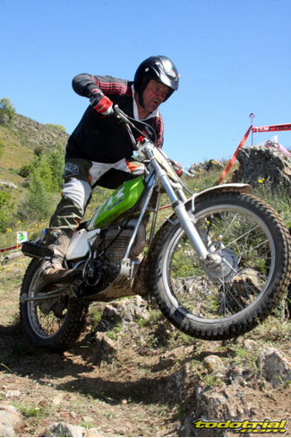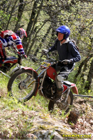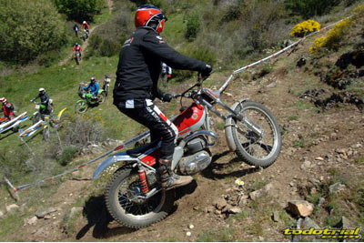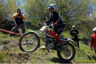 Y que decir de "El Monstruíto" Manuel Soler, otro de los grandes de este deporte, que un año más no quiso perderse la oportunidad de acudir a este trial y nos hizo disfrutar de su compañía y su siempre interesantes anécdotas y reflexiones. Tan sólo por volver a ver a estos dos grandes, ya merecía la pena desplazarse hasta Robregordo aunque fuese como mero espectador. Ver a Jordi a los mandos de una Beta TR34 Campionato de 1989, con su inconfundible estilo de siempre, con sus espectaculares giros aéreos pero sin llegar a parar en ningún momento, aprovechando los rebotes de la suspensión para girar en el aire o sacando la pierna para mantener el equilibrio, nos hacía volver con la mente a finales de los 80. Y no era para menos ver también a Manuel Soler a los mandos de una Bultaco Sherpa "Kit" realizando las trazadas con su absoluta precisión después de haber recortado el guardabarros delantero para poder ver exactamente por donde pisaban los tacos...
