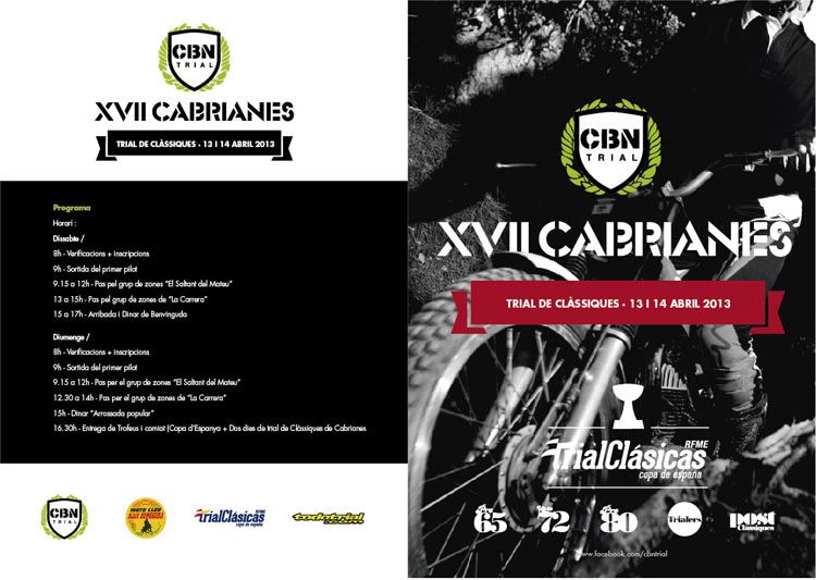 Los 2 Días de Trial de Clásicas de Cabrianes vuelven en su 17ª edición retornando a su antiguo formato, y por tanto dando cabida a todas las trialeras clásicas y también a las post-clásicas. Además será la primera cita de la Copa de España 2013 contando con clasificaciones diferentes, sin coeficientes para los 2 días y con coeficientes para cada día independiente de la Copa. El trial de clásicas de larga duración con más solera vuelve con más novedades que nunca. Para empezar será la primera vez que la prueba se disputa en abril (días 13 y 14), dando paso a una nueva etapa y abandonando la fecha tradicional que hasta ahora siempre había sido el último fin de semana de octubre. La nueva fecha tiene algunos alicientes, ya que en esta época no hay tanta saturación de competiciones clásicas por un lado, y por otro se convierte en el primer trial de larga duración del año, cuando muchos aficionados están ya deseosos de arrancar sus clásicas para disfrutar a lo grande en un dos días.