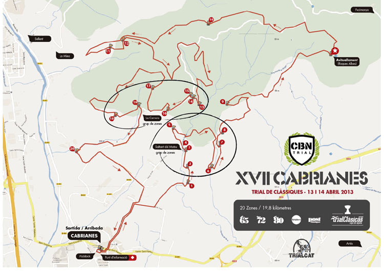 Ya está todo a punto para que este fin de semana se dispute la 17ª edición de los Dos Días de Trial de Clásicas de Cabrianes. El éxito de inscripción está siendo notable y hay muchos pilotos procedentes de países como Francia, Gran Bretaña o Italia. El terreno esta en excelentes condiciones y hay una muy buena previsión para el fin de semana, por lo que todo apunta a que disfrutaremos de un magnífico trial en un ambiente perfecto para el trial de clásicas. Actualizamos este reportaje previo con los últimos detalles... placas, señales, camisetas, recorrido y las fotos de algunas zonas. Recordad que aún estáis a tiempo para realizar la inscripción, si queréis puntuar para la Copa de España hasta el jueves a las 23:00 en la web de la RFME y lo mismo si sólo queréis puntuar para el 2 Días de Cabrianes rellenando el formulario que encontraréis al final de este reportaje previo.