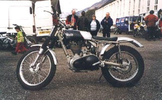 Decido empezar a desmontar la rueda y en ello estoy cuando aparece el Land Rover verde de Charly. Stuart, que viene con él, se pone rápidamente manos a la obra. Busca una gran piedra para apoyar la moto. En unos momentos tengo otra vez la moto a punto. Casco, guante, gas y otra vez en carrera. A todo esto habré perdido unos cuarenta y cinco minutos. Gas a fondo, llego a Kinlochleven escuchando un extraño ruido en la Greeves, parece algo de cadena y finalmente la moto se para. Llegan de nuevo Stuart y Charly. Solucionamos lo de la cadena, pero la moto no quiere ponerse en marcha, cambiamos la bujía y ...¡nada!. Decido empujar la moto y arranca (¡uf, por fin!).