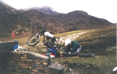 En Pap of Glencoe, después de conseguir un cero en la primera zona me doy cuenta de que he pinchado. Se lo comento a Mick y me dice: "Haces esta zona, bajas a la carretera y ahí estará Charly". Bueno, acabo con un varios y emprendo el duro camino hasta la carretera. Muchos participantes se paran para ayudarme, ayuda que declino amablemente a la espera de la asistencia. Hay un par de autocaravanas aparcadas junto a la carretera y en una de ellas me ofrecen una Coca-Cola y algo de comer. Lo acepto y se lo agradezco, ¡ hay que ver como de amable son esta gente!.