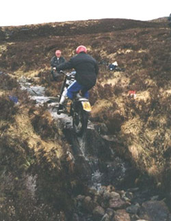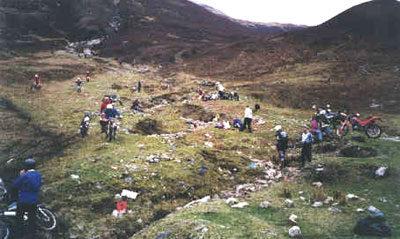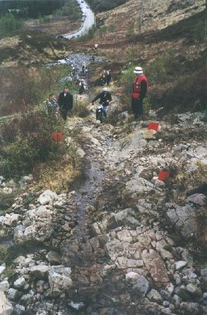 Después de hacer las cuatro zonas me encuentro en la parte alta del torrente, y desde aquí se divisa todo el valle, es inmenso. Rehago el camino hasta llegar a la zona que ya había visto, Am Bodach. No sé porque, pero me da por mirar el mapa del recorrido y consulto con el juez de zona que confirma mis sospechas. ¡Me he saltado tres grupos de zonas! La sensación que me invade es sólo comparable a la que sentí al llegar al ferry y darme cuenta que me había olvidado la cartera con el DNI y las tarjetas de crédito en casa de Stuart, en Cahors (Francia), ¡¡¡ la madre que me parió!!!. Bueno, unas millas extra no me vendrán mal, pero empiezo a percibir una sensación rara en la dirección de la moto (????).