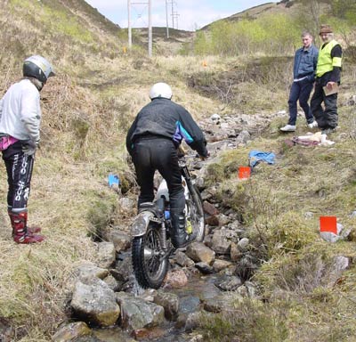 La zona es Pollock Hill, había leído algo sobre esta zona en las revistas clásicas sobre los Scottish, creo que ya la hacían en aquellos años. Es una torrentera de piedra y no tiene pinta de ser nada fácil, o sea que me paro un momento y dudo si subir a mirarla, pero no puedo. Otra vez le pido permiso al juez, y mientras está empezando a decir el típico "Are you ready? ya he entrado a toda velocidad, segunda y rápido, a los veinte metros ya llevo tropecientos pies, pero la moto sigue avanzando y llego al final a varios, podía haber sido peor. Aún quedan cinco zonas, aún tengo quince minutos, voy a ritmo, pero todo depende de si los grupos tienen las zonas seguidas o no.