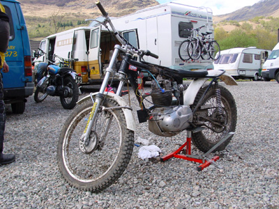 Nos espera una "bonita" subida por el sendero hasta llegar al camino que llega a Kinlochleven, y Jaume y yo empujamos su BSA cuesta arriba. Aquí se aprecia claramente la diferencia con una ligera Bultaco, y aún más con respecto a una GG Pro, que parece una mountain bike al lado de la B40, pero resoplando llegamos arriba. Ahora me toca volver a por mi moto y cuando alcanzo a Jaume empiezo a empujarle desde mi moto en marcha con mi pié en su estribo. A los pocos minutos llegamos a la furgo y sacamos las cajas de herramientas, le echo una ojeada al reloj y ya solo quedan cincuenta minutos para mi hora de entrada, las 16.09.