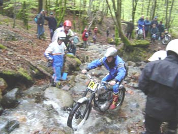 !!!! POR FIN ESTAMOS EN CARRERA !!!! Aquí las zonas se llaman secciones, cada sección puede ser de una, dos o más zonas, la mayoría tienen dos zonas. Bueno, siguiendo con la carrera, después de una pequeña interzona llega la primera sección de dos zonas, entre árboles discurre un río ancho lleno de agua y piedras. Dos zonas preciosas, poca dificultad pero dejarse pies es sencillísimo, nada mal, la primera cero pies la segunda un pie. Continuamos otra sección, zona en subida con giro a la derecha y salida por encima de piedras, interzona larga con blackwaters incluidos. Por cierto el que escribe fue a parar a uno de ellos, resultado: salida por delante, besar el suelo y empastar de barro, la moto la sacamos entre seis personas.